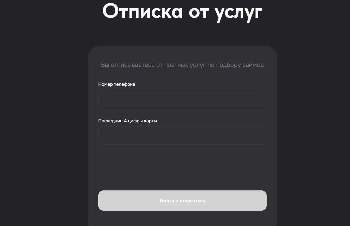 Для отписки через форму на сайте укажите номер телефона, который использовали при регистрации, и последние 4 цифры банковской карты. Обработка заявки на отписку занимает до 15 рабочих дней — в течение этого времени могут продолжаться списания. Сохраните скриншот заполненной формы как подтверждение подачи заявки.